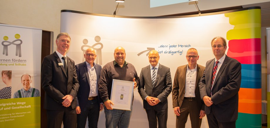 Auf dem Bild v.l.n.r.: Ludger Lünenborg (stellv. Geschäftsführer des Lernen fördern e. V., Kreisverband Steinfurt), Thomas Göcke (Fachdienstleiter Organisation, Personal und IT der Stadt Emsdetten), Sven Mendelin (Teamleiter Baubetriebshof Stadt Emsdetten), Dr. Martin Sommer (Landrat des Kreises Steinfurt), Oliver Kellner (Bürgermeister der Stadt Emsdetten), Reiner Zwilling (Vorsitzender der Geschäftsführung der Agentur für Arbeit Rheine)