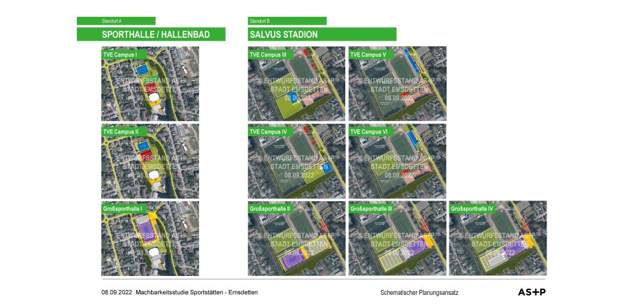 Die verschiedenen Funktionsskizzen machen deutlich, dass es für beide Standorte unterschiedliche Entwicklungsmöglichkeiten gibt. Sowohl die von der TVE Marketing GmbH geforderte Großsporthalle, als auch der vom TVE Gesamtverein geforderte TVE Campus könnten auf den Flächen der heutigen Spiel- und Sporthalle bzw. dem Hallenbad errichtet werden. Das Gymnasium Martinum würde von beiden Entwicklungen durch Synergieeffekte und zusätzliche Räumlichkeiten profitieren. Am Salvus Stadion wären ebenfalls sowohl die Großsporthalle als auch der TVE Campus möglich. Je nach Ausgestaltung hätte dies unterschiedliche Auswirkungen auf die SpVg Emsdetten 05, die Tennisgemeinschaft sowie die Lauf-Gemeinschaft. Neben räumlichen Einschränkungen und Neuordnungen wären je nach Variante auch Synergieeffekte durch gemeinsame Nutzungsoptionen zu erwarten.