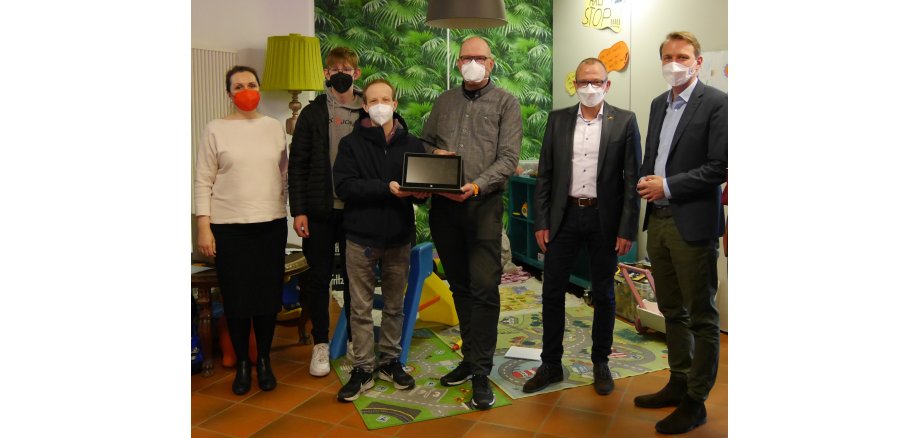 Auf dem Bild v.l.n.r.: Svitlana Eitelbach (Koordinatorin Ukraine-Projekt), Leo Vaske und Jonas Kock (Beide Informationstechnologie der Stadt Emsdetten), Christian Schöler-Koch (Vorstand Kreisel e.V.), Oliver Kellner (Bürgermeister der Stadt Emsdetten), Jan-Niclas Gesenhues (Mitglied des Deutschen Bundestages / Bündnis 90/Die Grünen)