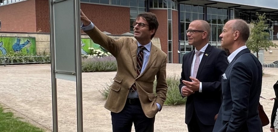 Bei einem Rundgang durch die Emsdettener Innenstadt informierte Bürgermeister Oliver Kellner die Gäste aus Münster über die Umsetzung diverser Förderprojekte. Teil des Spaziergangs waren beispielsweise die mobilen Bäume auf dem Rathausplatz, der Bahnhof mit den Radabstellanlagen sowie die Umgestaltung der Innenstadt. Ein kurzer Stopp wurde zudem in Stroetmanns Fabrik eingelegt, wo sich die Sanierungsarbeiten derzeit in vollem Gange befinden. Über den Hof Deitmar, am August-Holländer-Museum vorbei, ging es dann zurück zum Rathaus. „Sie zeigen, wie sich eine Stadt entwickeln kann“, zeigte sich der Regierungspräsident insgesamt von Emsdetten begeistert. „Viele Gebäude sind Zeugen ihrer Zeit mit einem gewissen Charme, die aber auch eine Weiterentwicklung erlauben“, so Regierungspräsident Andreas Bothe weiter.