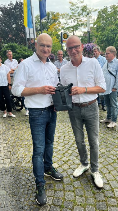 Landrat Dr. Martin Sommer überreicht Bürgermeister Oliver Kellner eine „gefüllte“ Fahrradpacktasche als Geschenk