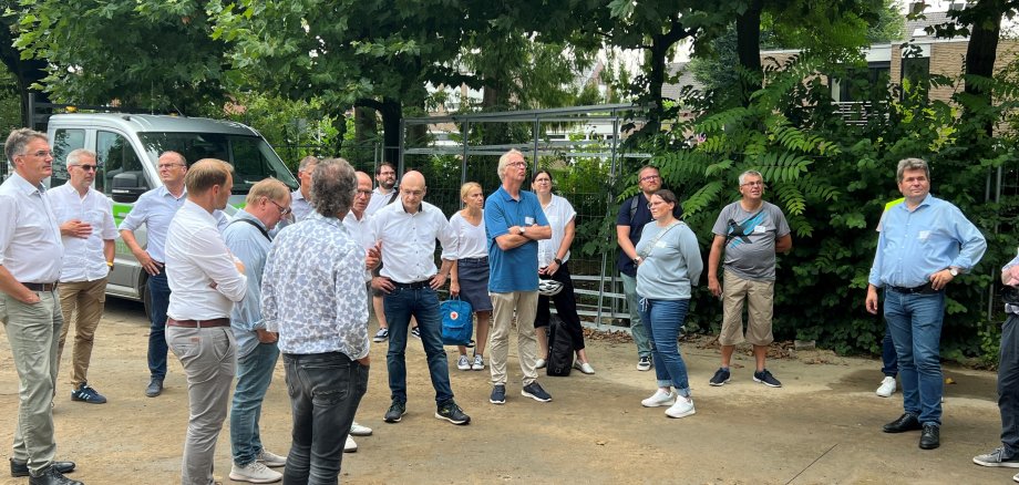 Los ging es am Rathaus, wo Bürgermeister Oliver Kellner nicht nur Landrat Dr. Martin Sommer, sondern auch Mitglieder der Kreisverwaltung und des Emsdettener Stadtrats begrüßen durfte. Zusammen startete die Gruppe in Richtung Wilhelmschule, deren Neubau sich in der Endphase befindet. In diesem Zusammenhang konnten die Radelnden auch einen Blick auf unterschiedliche Grünflächen sowie deren Beitrag zur Biodiversität im Stadtgebiet werfen.