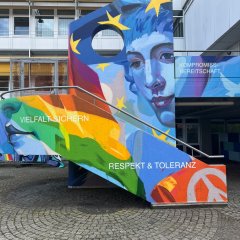 Die Künstlerinnen und Künstler der Agentur besprühten mit der Außentreppe zum Ratssaal und der gegenüberliegenden Stützwand insgesamt rund 67m² Fläche. Die Stadt wählte diesen Ort bewusst aus – die Treppe symbolisiert den Weg in den Ratssaal, in dem sich lokale Demokratie abspielt. Die künstlerische Gestaltung macht diesen Weg nun auch visuell zu einem Ausdruck demokratischer Teilhabe.
