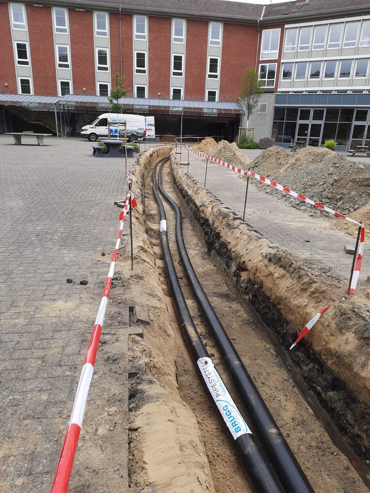 Die Arbeiten zum Bau eines neuen Nahwärmenetzes am Gymnasium Martinum liegen voll im Zeitplan. In den Herbstferien soll die neue zentrale Heizungsanlage fertiggestellt werden, die dann das Gymnasium, die benachbarte Wilhelmschule und die angrenzende Zweifachsporthalle mit Wärme versorgt.