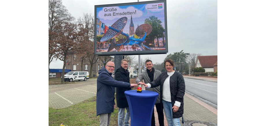 Auf dem Bild v.l.n.r.: Bürgermeister Oliver Kellner, Christian Hövels (ServiceCenter Wirtschaft der Stadt Emsdetten), Felix Hoffmann (Verkaufsleiter Ströer Deutsche Städte und Medien GmbH) und Ute Buschmann (Niederlassungsleiterin Ströer Deutsche Städte und Medien GmbH)