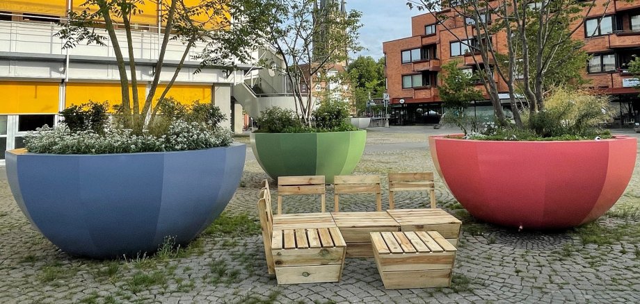 Das Mobiliar aus Holz im Lounge-Charakter fügt sich optisch gut in die übrige Rathausplatzgestaltung ein und soll die Aufenthaltsqualität weiter steigern. Sollte dieses Angebot gut angenommen werden, sind weitere verschiedene Arten von Ruhepolen im Innenstadtgebiet denkbar.