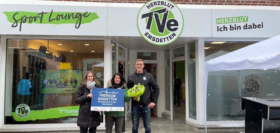 Auf dem Bild v.l.n.r.: Michelle Dresemann und Nicole Mahlmann vom ServiceCenter Innenstadt der Stadt Emsdetten, Florian Ostendorf (Geschäftsleiter TVE Emsdetten)