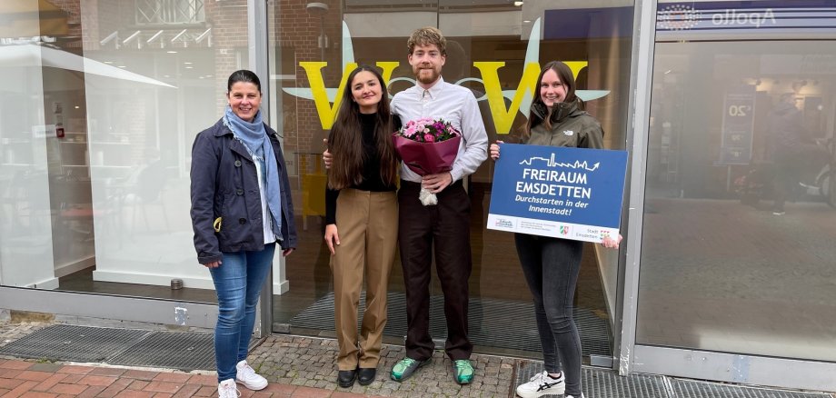 Auf dem Bild v.l.n.r.: Nicole Mahlmann (ServiceCenter Innenstadt der Stadt Emsdetten), Alexandra Akanbaew, Lukas Wolters und Michelle Dressemann (ServiceCenter Innenstadt der Stadt Emsdetten)