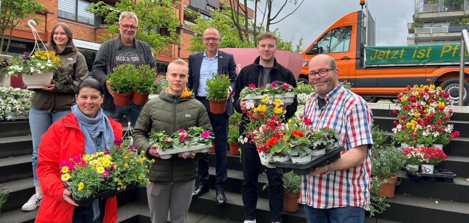 Auch in diesem Jahr organisierte das ServiceCenter Innenstadt der Stadt Emsdetten gemeinsam mit dem städtischen Baubetriebshof eine farbenfrohe Auswahl unterschiedlicher Blumen. Rund 50 Gewerbetreibende nutzten das unkomplizierte und kostenfreie Angebot und wählten passende Pflanzen für ihre Geschäftseingänge. Wer vor Ort noch Fragen zur Einpflanzung oder richtigen Pflege hatte, wurde von den anwesenden städtischen Gärtnerinnen und Gärtnern Ralf Deupmann, Theresa Beckmann, Sebastian Macht und Michaela Helmer direkt beraten.