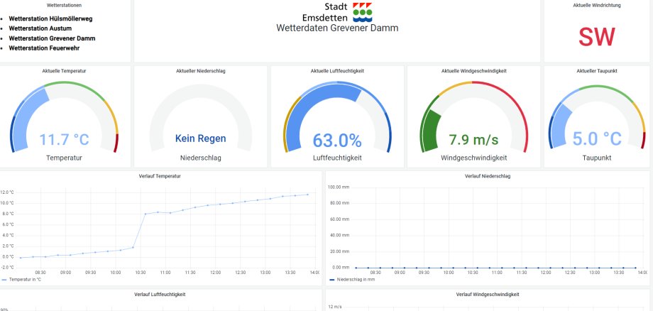 Vier Wetterstationen, darunter drei städtische und eine private, liefern qualitativ hochwertige Wetterdaten wie zum Beispiel Temperatur, Luftfeuchtigkeit, Windgeschwindigkeit und Windrichtung von den Standorten Feuer- und Rettungswache, Austum, Hülsmöllerweg und vom Grevener Damm.