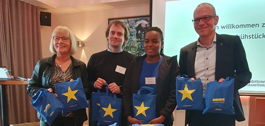 Zusätzlich stand das Wirtschaftsfrühstück auch im Zeichen der bevorstehenden Europawahl. So war das Kooperationsprojekt „Europäische Frühstückspause – Ich wähle Europa!“ von der Europa-Union Steinfurt e.V. und Europe Direct Steinfurt zu Gast. Die Anwesenden der beiden Organisationen informierten über die Wahl zum Europäischen Parlament am 9. Juni 2024, appellierten zur Teilnahme und verteilten Frühstückstaschen mit essbaren EU-Spezialitäten.