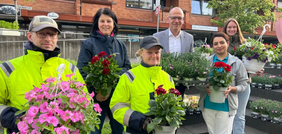 Dort gab es neben einer kompetenten Beratung durch die städtischen Gärtnerinnen und Gärtner Farina Strotmann und Sebastian Macht zahlreiche Gratis-Musterpflanzen für ihre Geschäftseingänge. Neben blühenden Petunien standen auch insektenfreundliche Pflanzen wie Lavendel, Husarenköpfchen und Strohblumen zur Auswahl.