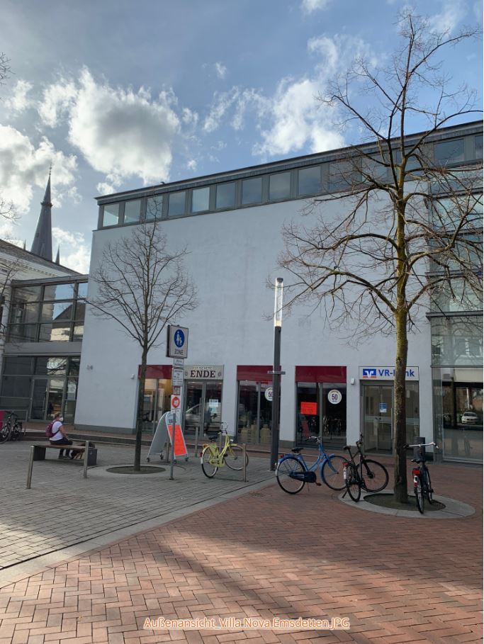 Büroetage im 2. OG in der Bahnhofstrasse, mit Sozialräumen, sanitären Anlagen. Im Gebäude "Villa Nova". Mit schrägem Blick auf den Marktplatz und runter in die Fußgängerzone Richtung Bahnhof bzw. in die Emsstraße. Eingang über Bahnhofstraße. Tiefgaragenstellplätze können dazu gemietet werden. Verschieden große Räume. 2 WC-Räume. Die Raumaufteilung kann nach eigenen Wünschen angepasst werden. Nebenan befindet sich das Kino. Unten drunter ein Drogeriemarkt, eine Fleischerei, ein Frisör, gegenüber ein Schnellimbiss. Zwei Supermärkte in der Nähe. Alles was man braucht ist da. Der Bahnhof ist in unmittelbarer Nähe. Zugverbindungen Richtung Münster und Rheine mehrmals die Stunde.