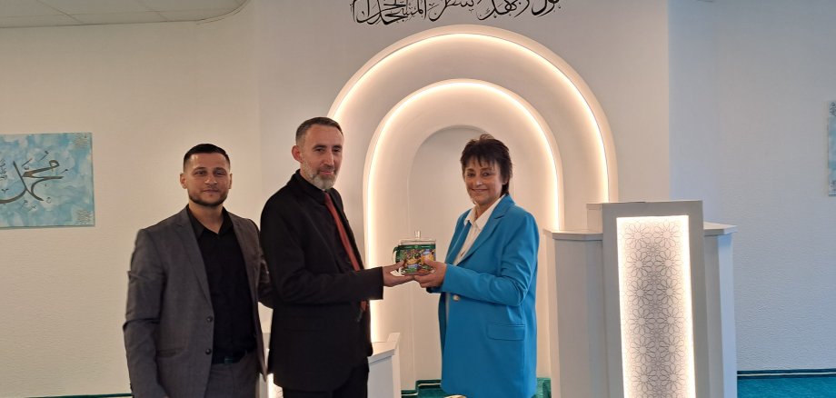 Die albanische Moscheegemeinde IKRA e.V. feierte an diesem Tag auch die Neueröffnung ihrer Moschee. Beatrix Steinbach-Möllers, stellvertretende Bürgermeisterin, gratulierte mit einem Geschenk zur Eröffnung und sprach Worte über die Bedeutung von Akzeptanz, Toleranz und friedlichem Zusammenleben in Emsdetten und im gesamten Deutschland.