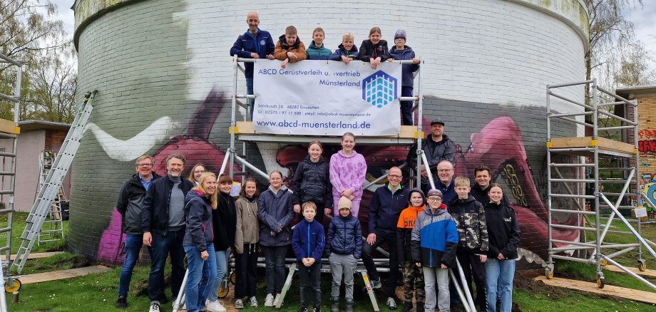 Die Jugendlichen konnten sich auf der Fläche am Faulturm und auf einer benachbarten Wand mit ihren eigenen Ideen „kreativ austoben“. Herausgekommen ist ein spektakuläres Großgraffiti mit Emsdetten-Schriftzug und einem lila Seeungeheuer, das eine Schatztruhe in den Tiefen des Ozeans bewacht... Unterstützt wurde das Projekt auch von der Emsdettener Fa. abcd-Gerüstverleih und –vertrieb Münsterland, die mehrere Gerüste gestellt hatten, damit die Kids auch in großen Höhen sicher arbeiten konnten. Wer sich das Kunstwerk anschauen möchte: das Gelände am Alten Klärwerk ist zu den Öffnungszeiten der Skateranlage frei zugänglich.